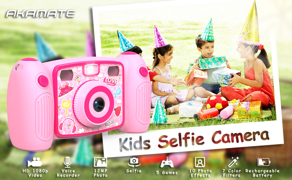 AKAMATE Kids Selfie Digital Camera shoots 12MP bright photos and 1080p HD videos with sound. Not only supports front & rear camera but also features 2.0" color screen, a voice recorder, 5 built-in smart games, 10 fantasy photo effects, 7 color filters and more that add to the fun. This children's camcorder includes all the accessories: rechargeable battery, neck strap and biggest bonus 32GB SD card, your little photographers can enjoy arrival-play fun. Best birthday/ holiday/ Christmas gift toys designed for 4+ years old kids.- 【Creative Camera Toy for Kids】: AKAMATE selfies digital camera allowing you to snap real 12MP bright images and HD 1080p@/30fps videos with sound. It features 2.0" color screen, an easy-to-use interface, a voice recorder, 5 built-in smart games, 10 fantasy photo effects, and 7- color filters, the best birthday /Christmas / holiday gift for kids 4-12 years.