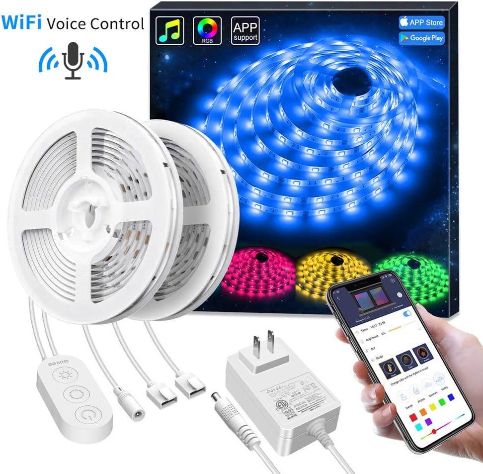 - This one to install: just plug and use, an easier and more stable connection, you don't need a complex pin connector. It comes with a power adapter listed in ETL, a WiFi controller box, 2 rolls of 16.4-foot led strip of light [32.8 feet in total]. Gove strives to build a home with a smart connection, the Govee Home app continues to be updated for smarter device compatibility.