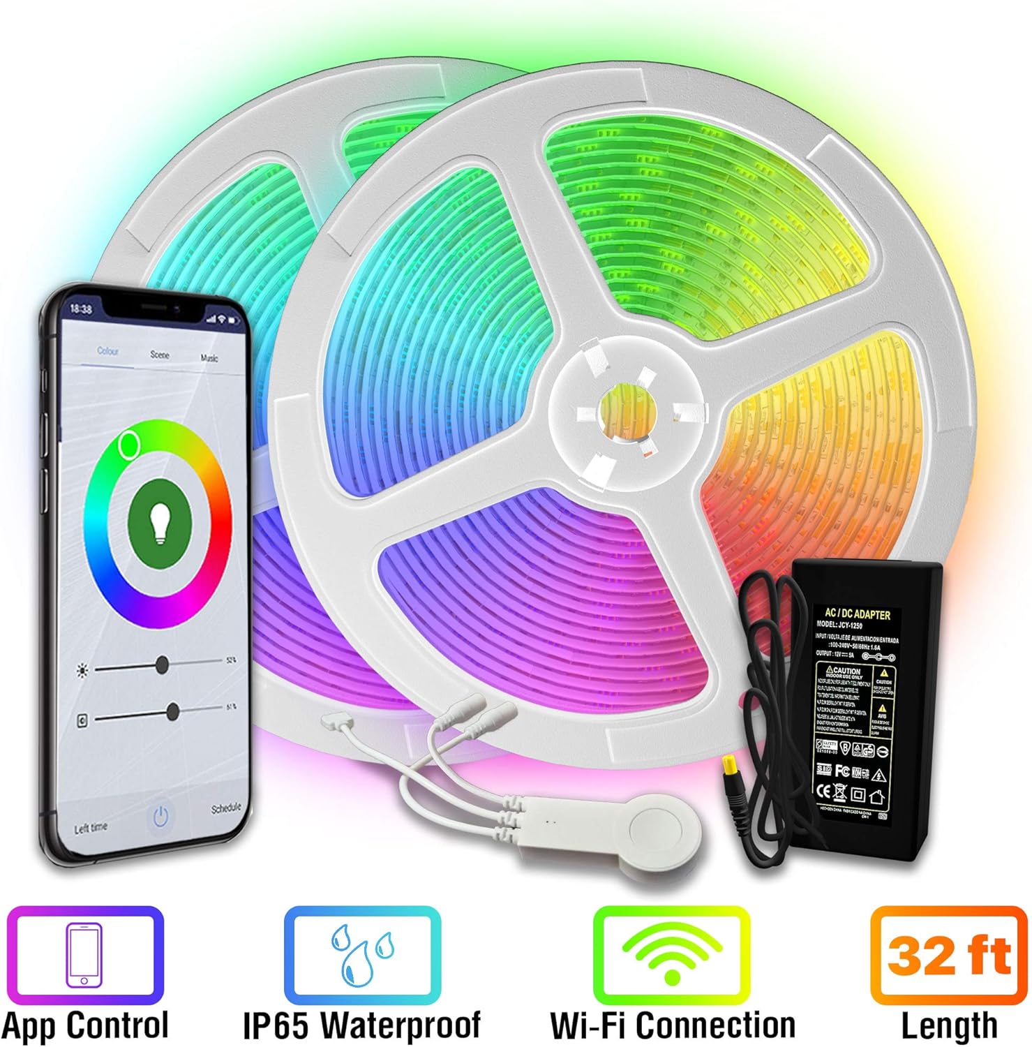- Complete Kits: Includes 5050 RGB ORIGINAL BAILONGJU LED strip Continuous lights of 10 meters/roll, 12V, 5A power supply, Bluetooth smartphone application controller.