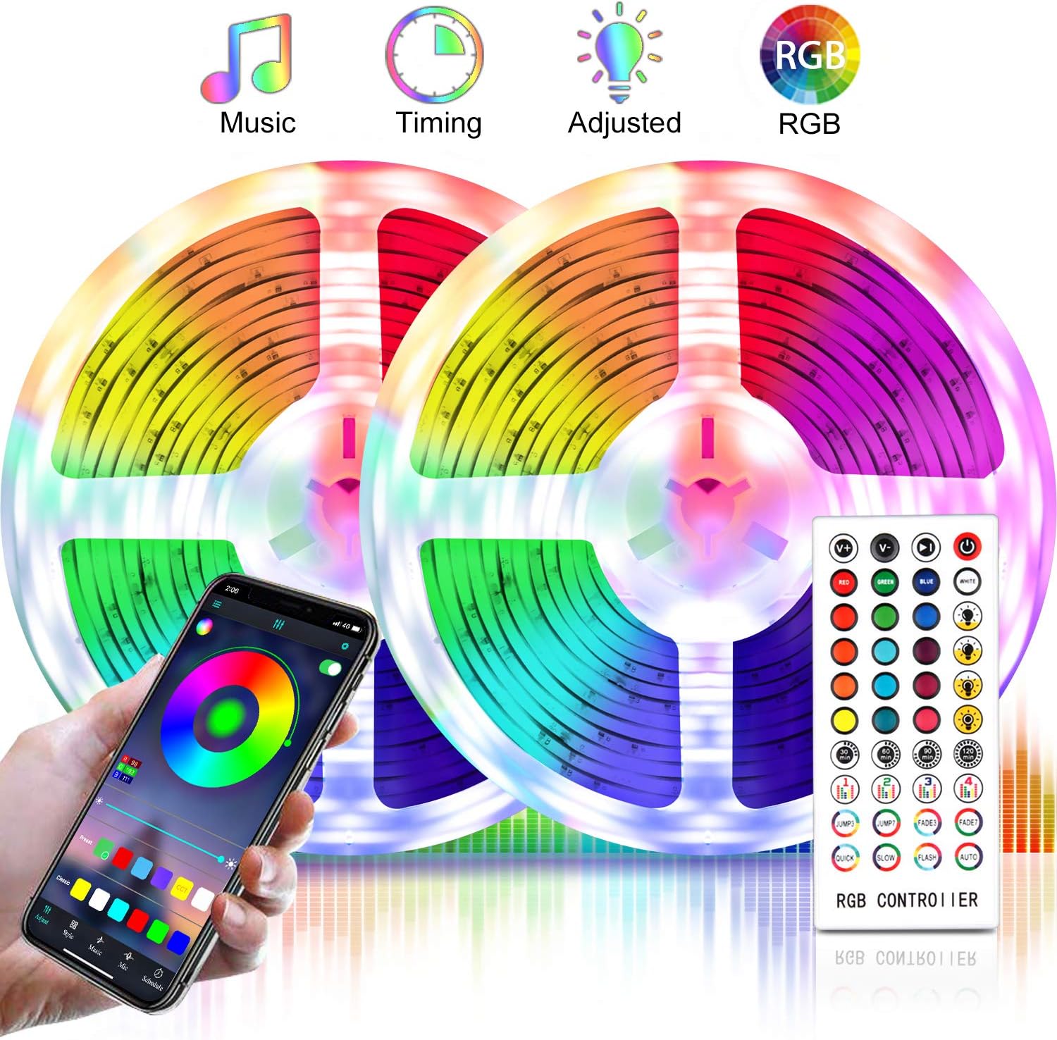 - Lights music strip with RF Remote and Timing Settings】 - Music lights strip with RF remote, sensing angle is 360 degrees, very sensitive and stable, the effective control distance is 0 ~ 39 ft. 4 timing settings mode: 30min / 60min / 90min / 120min, you can set the time mode according to your demand. The light strip can help you sleep in a warm lighting